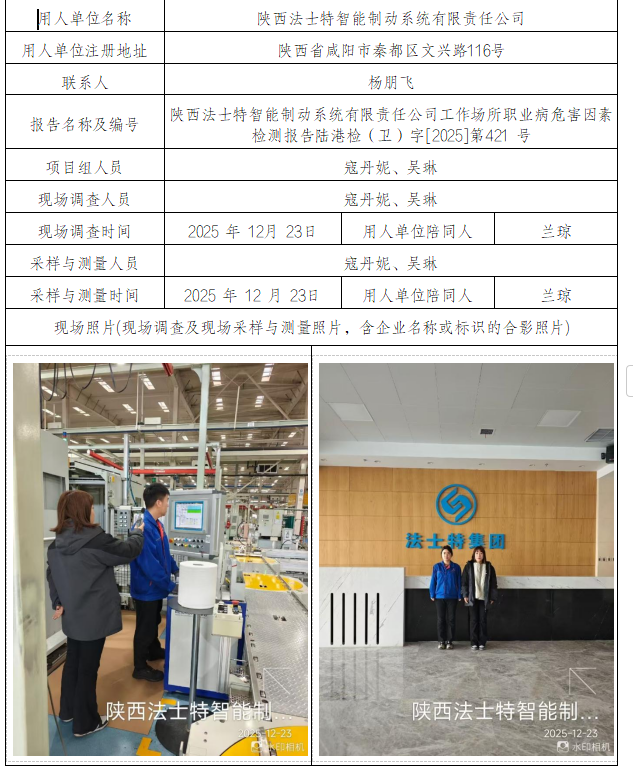 陕西法士特智能制动系统有限责任公司工作场所职业病危害因素检测