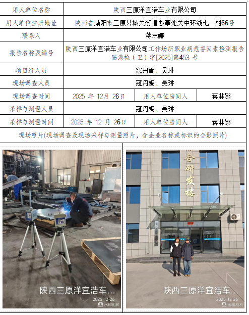 陕西三原洋宜浩车业有限公司工作场所职业病危害因素检测